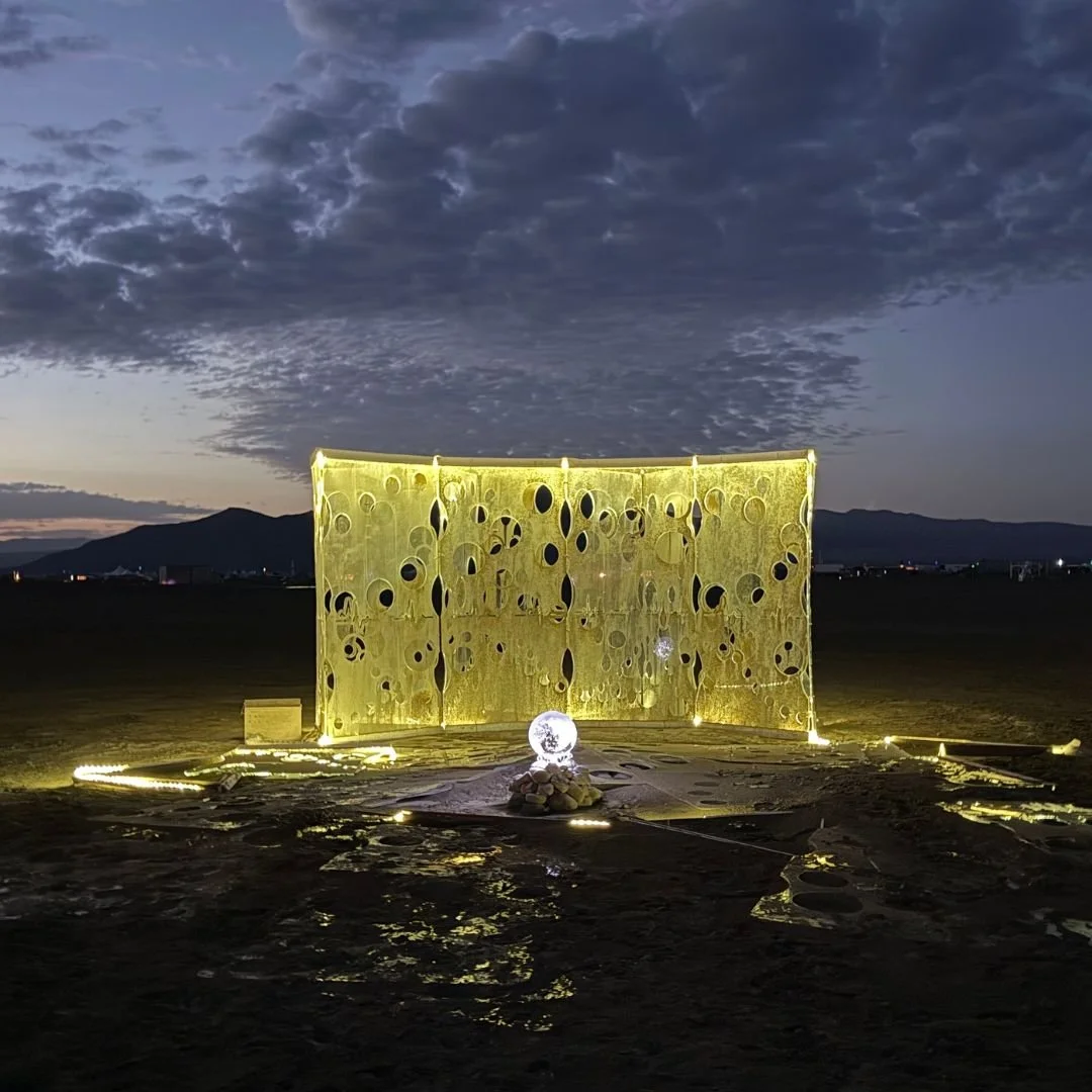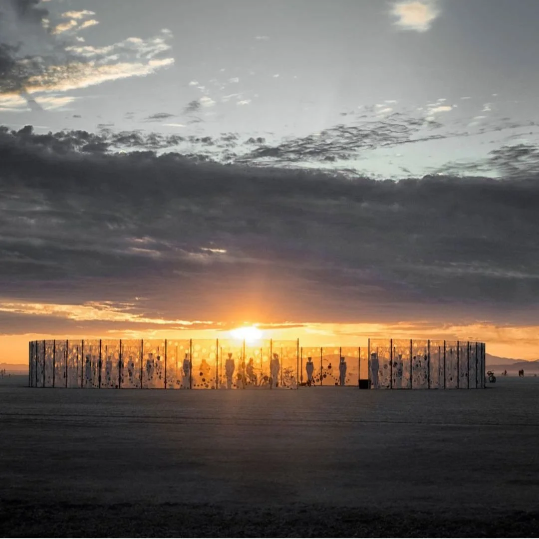 A 250-foot circle of light designed as a convergence of time, space, and frequency invited reflection on shared humanity and collective clarity. Interactive humanoid sculptures invited participation as evolving graffiti-like evolving stories around themes shaping our world.