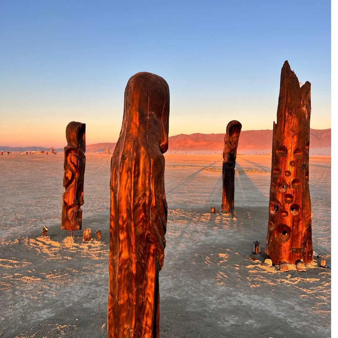 A reflection on interdependence, reciprocity, and death as a generative force. Reclaimed trees, carved into fire spirit totems, became focal points for exploring the endings that drive our beginnings, our relationship with chaos and order, and what must burn.