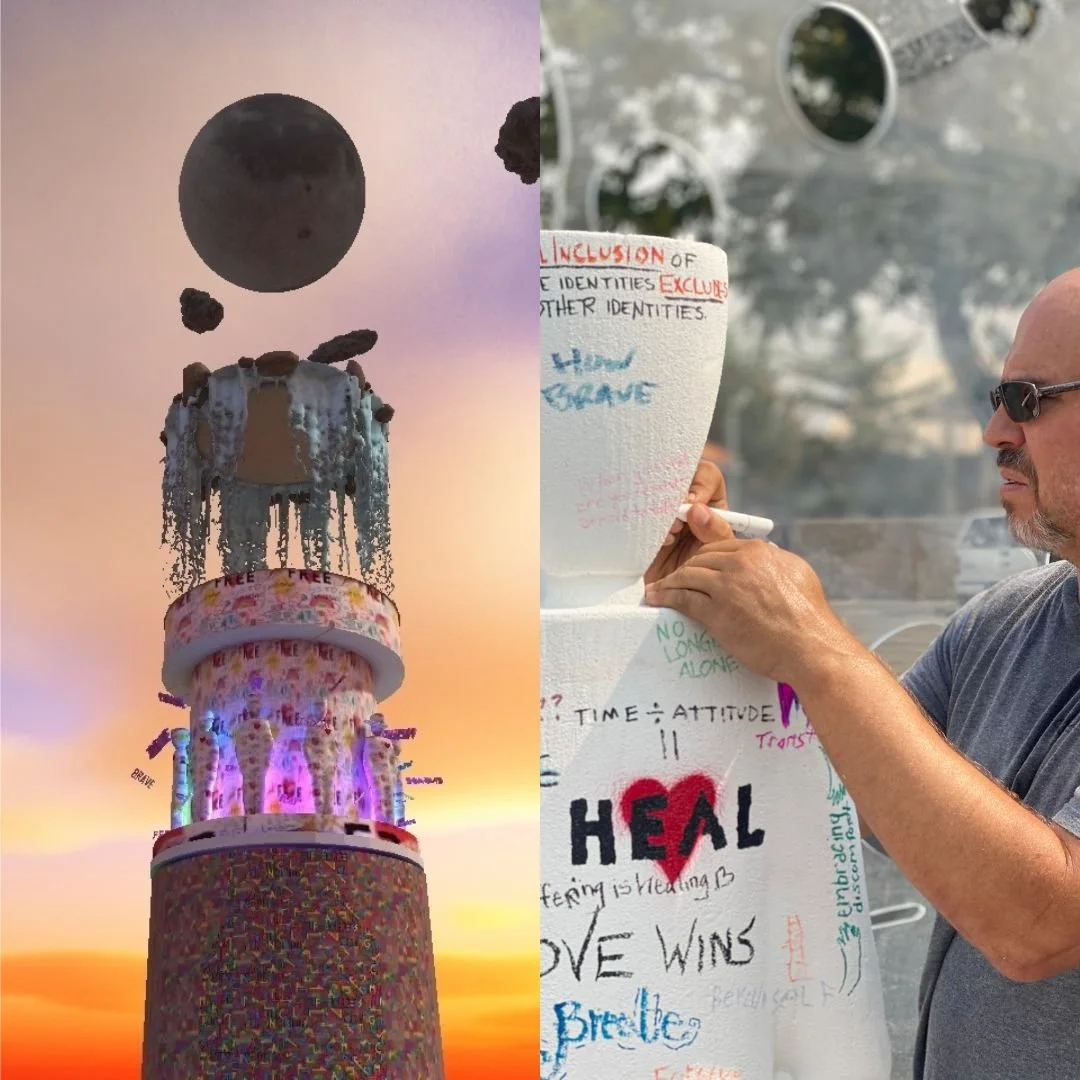 Created during the COVID-19 lockdown as a cross-continental collaboration between artists and technologists. A 500-foot digital tower in AltSpaceVR interacted with physical sculpture ,experiences, and performances.